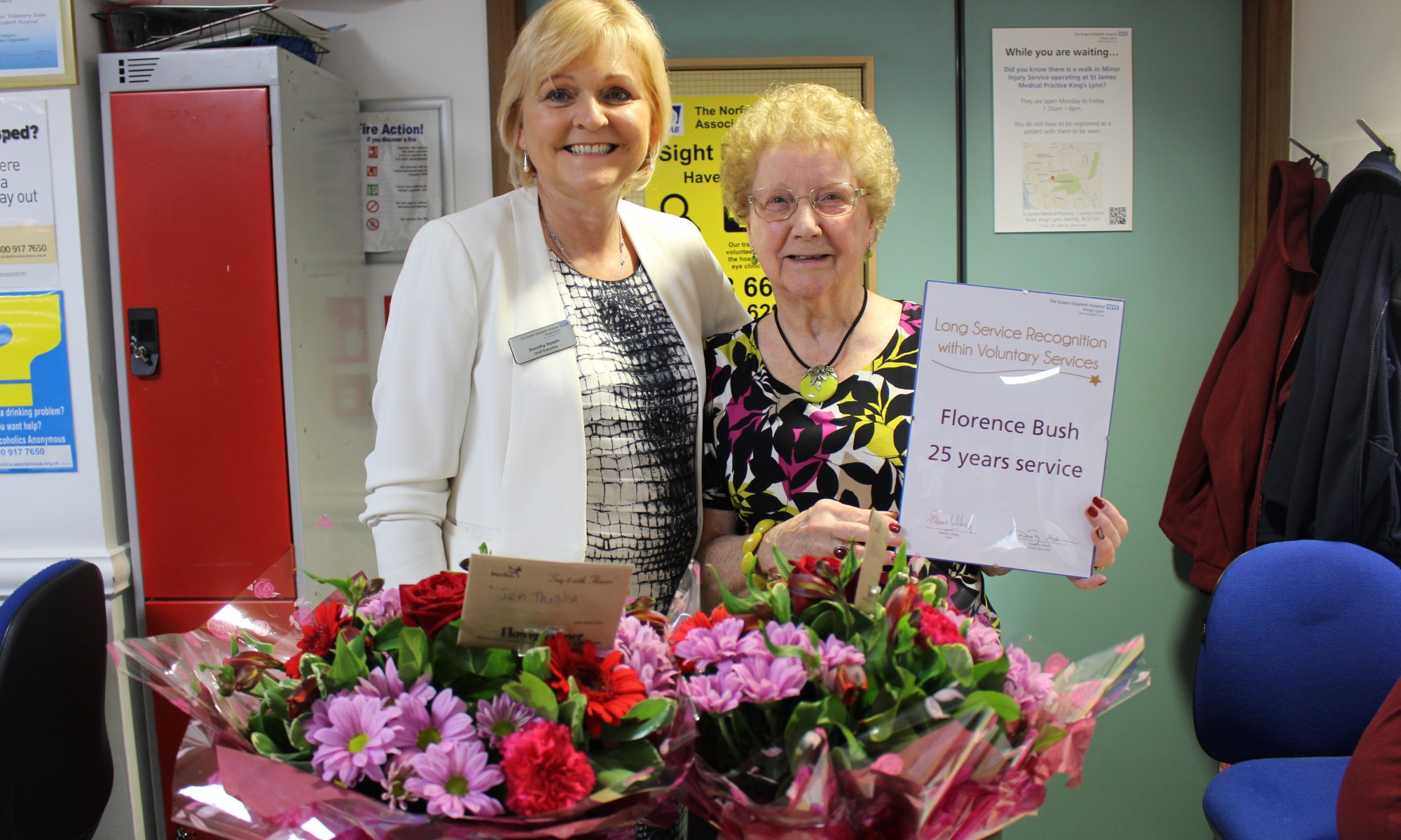 While manning the foyer, Mrs Bush first met her partner Raymond Dowsett MBE, who regularly visited the hospital in his role as Chairman of the Lynn Heart Support Group.