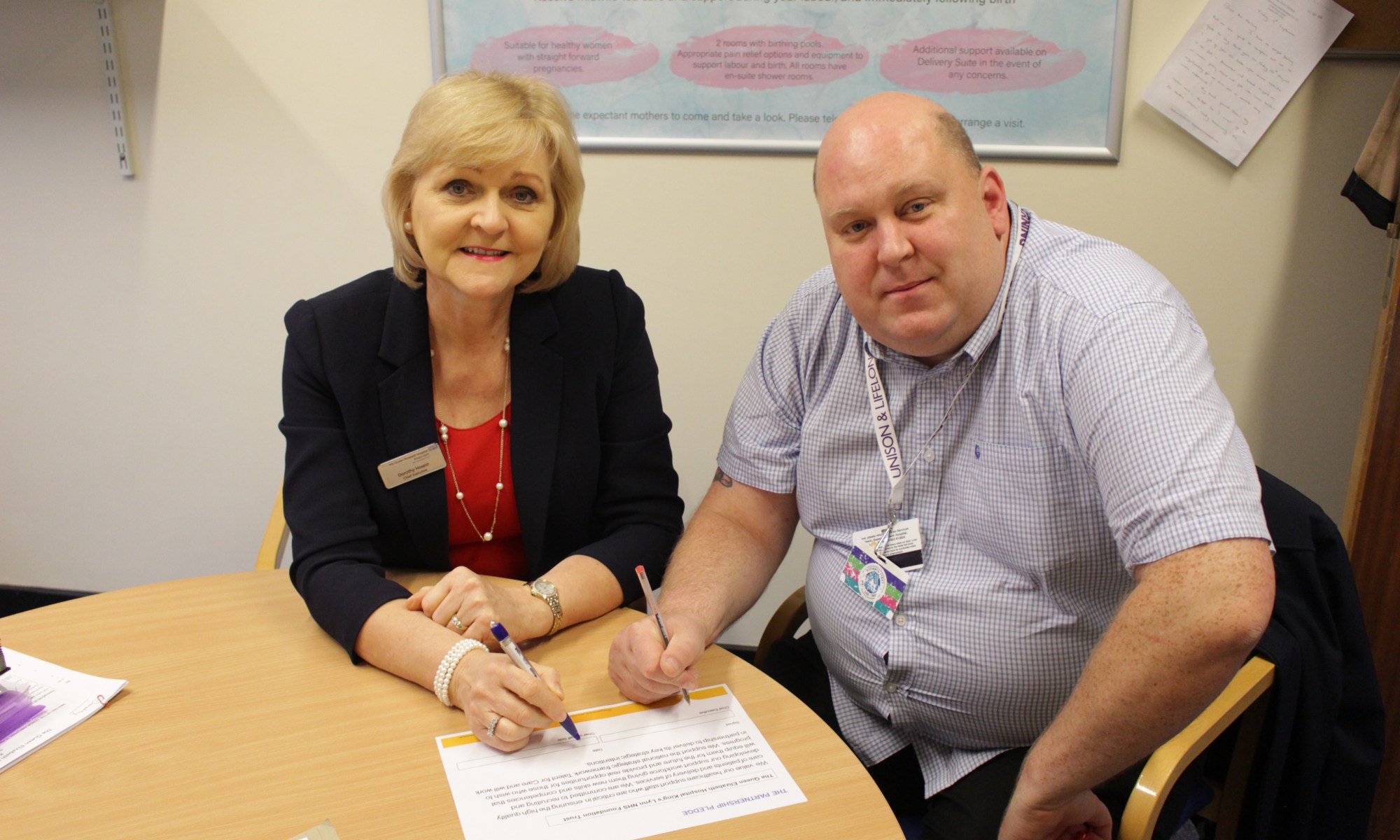Hospital Chief Executive Dorothy Hosein is pictured signing the pledge with Joint Staffside Committee Chairman Darren Barber