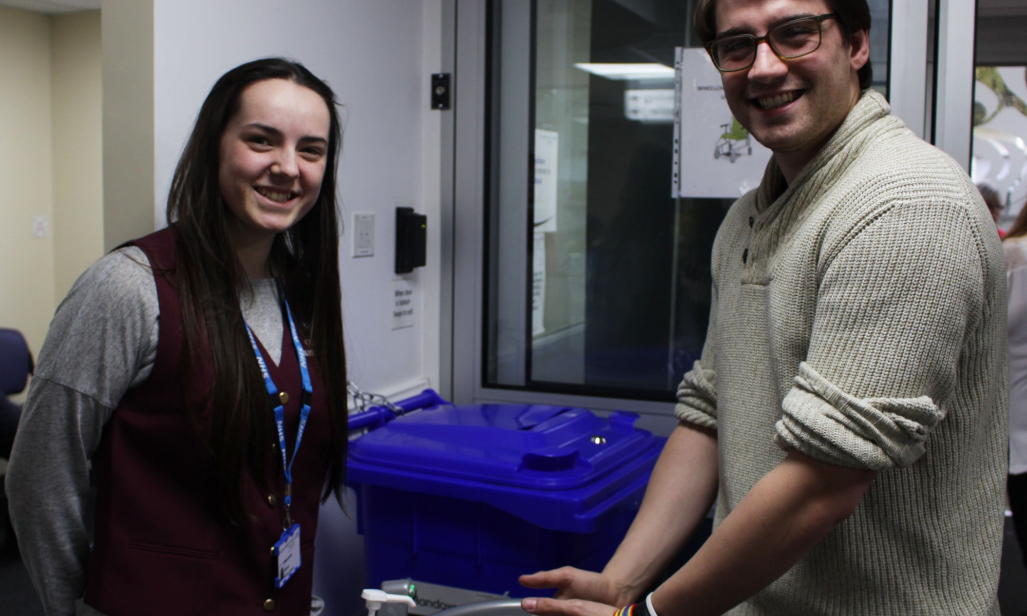 Volunteer Emma Bacon is pictured encouraging visitor Joe Zilch to wash his hands in one of the two mobile sinks.