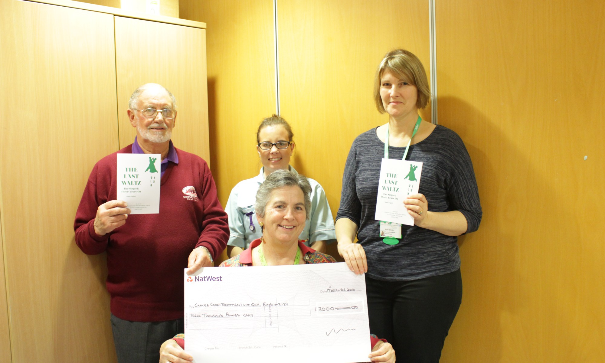 Gavin English is pictured with Nursing Auxillary Lisa Newman and Fundraising Executive Laurence Morlaàs (seated) and Hospital’s Macmillan Information and Support Manager Vicky Mitchell
