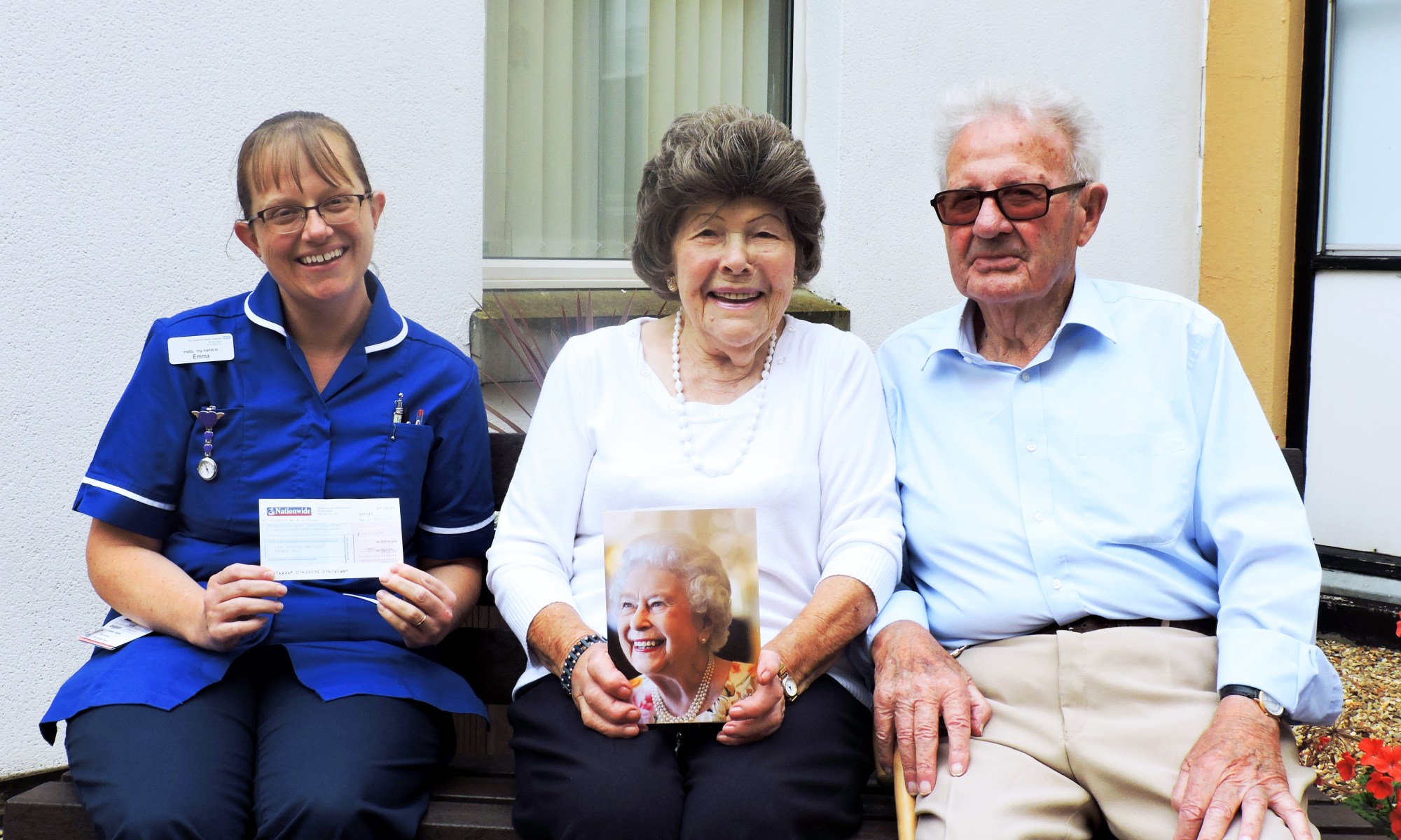 Shouldham Ward Sister Emma Wren receives the cheque from Dorothy and Danny Noone, who raised £540 during their 70th wedding anniversary.