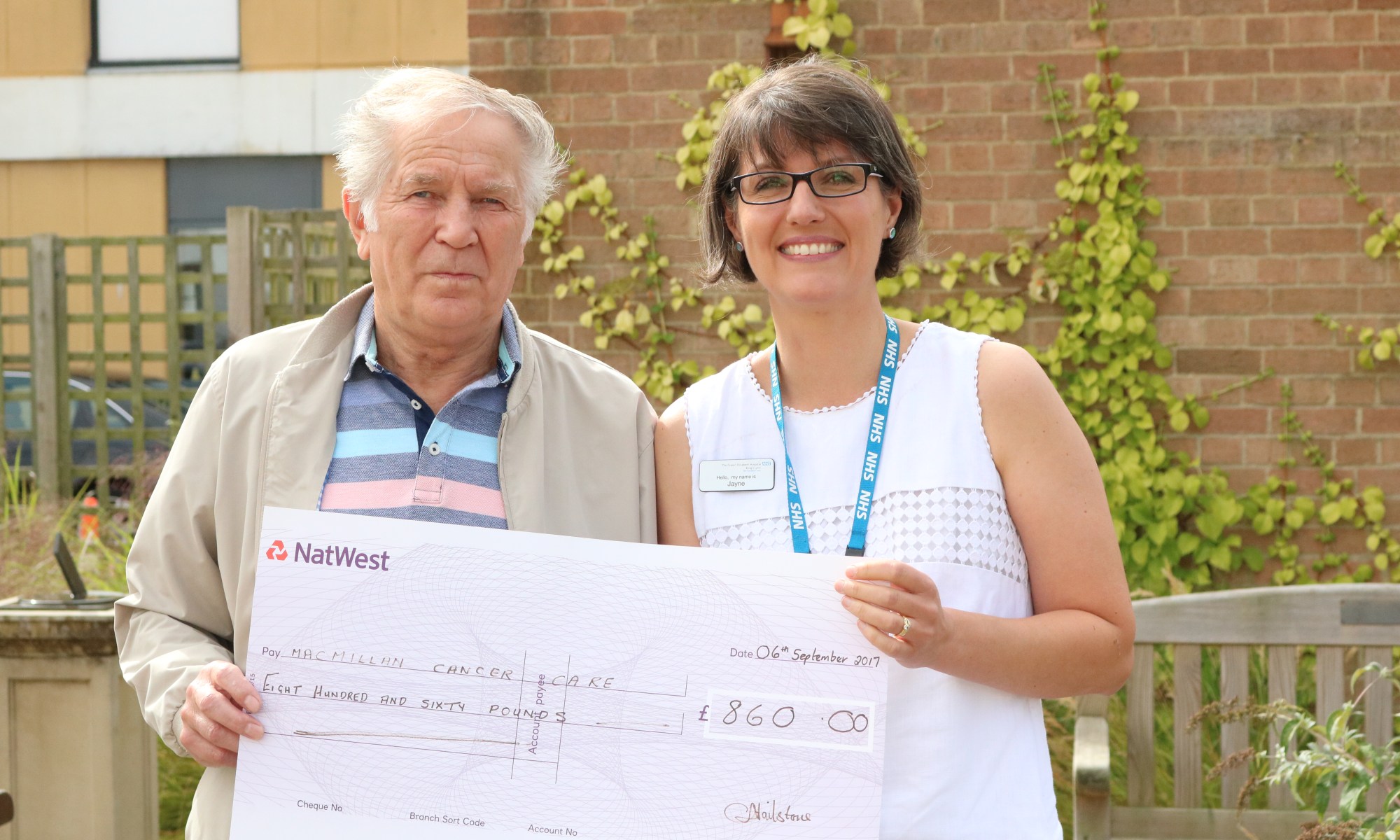 He presented the cheque for the Hospital’s Cancer Care and Treatment fund to Nurse Jayne Johnson.