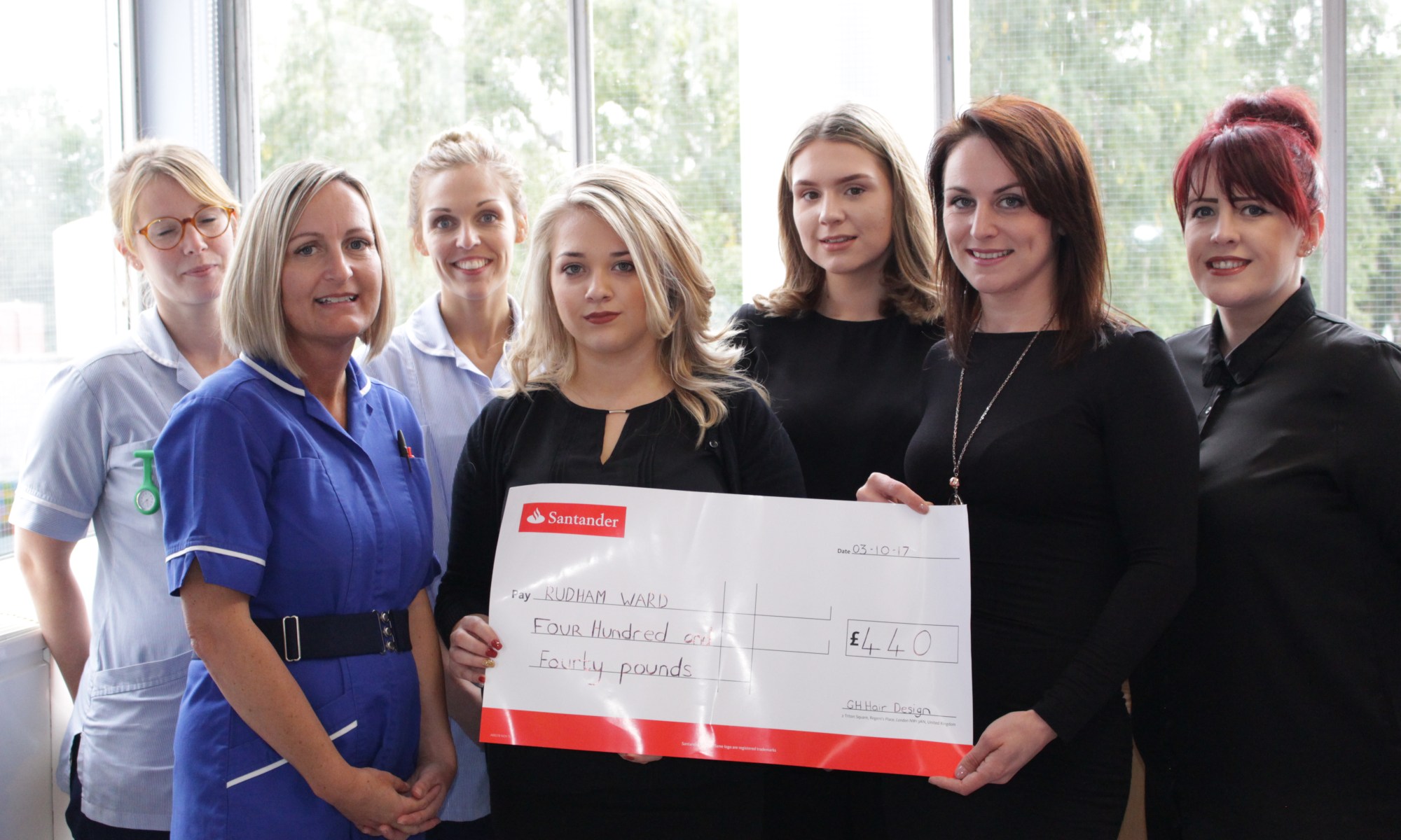 Rudham Ward Sister Kristy Bowman, with staff nurses Laura Morgan and Katie Collison, receive the cheque from the GH Hair Design team: Georgina Mountain, Abbie Claxton, Kelly Davies and Gemma Howard