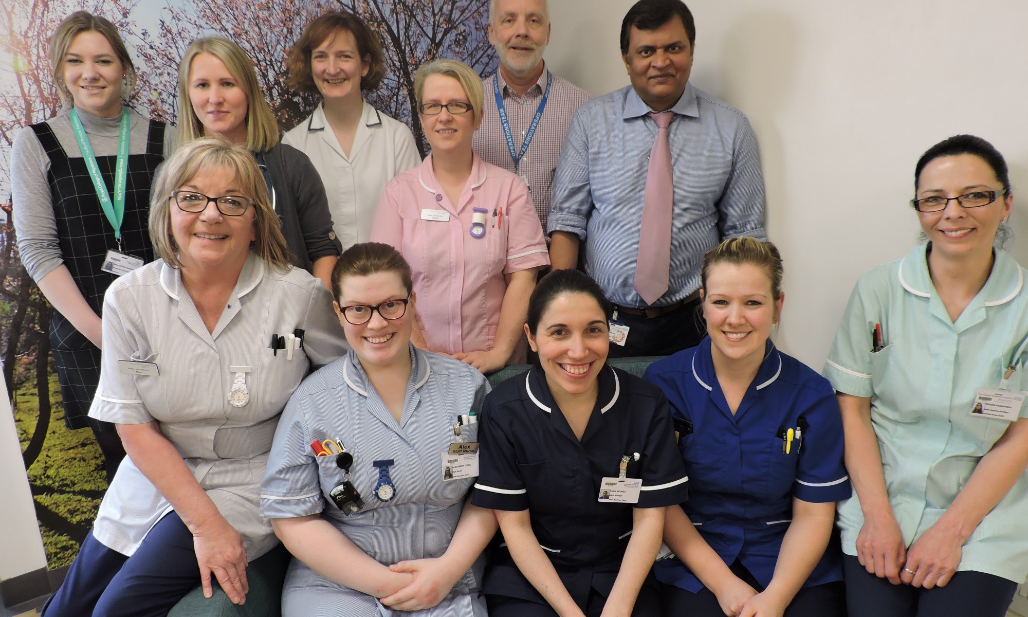 Photo caption: Stroke consultant Dr Umesh Rai (back, right) and Senior Service Manager John Crelly with some of the staff on West Raynham Ward