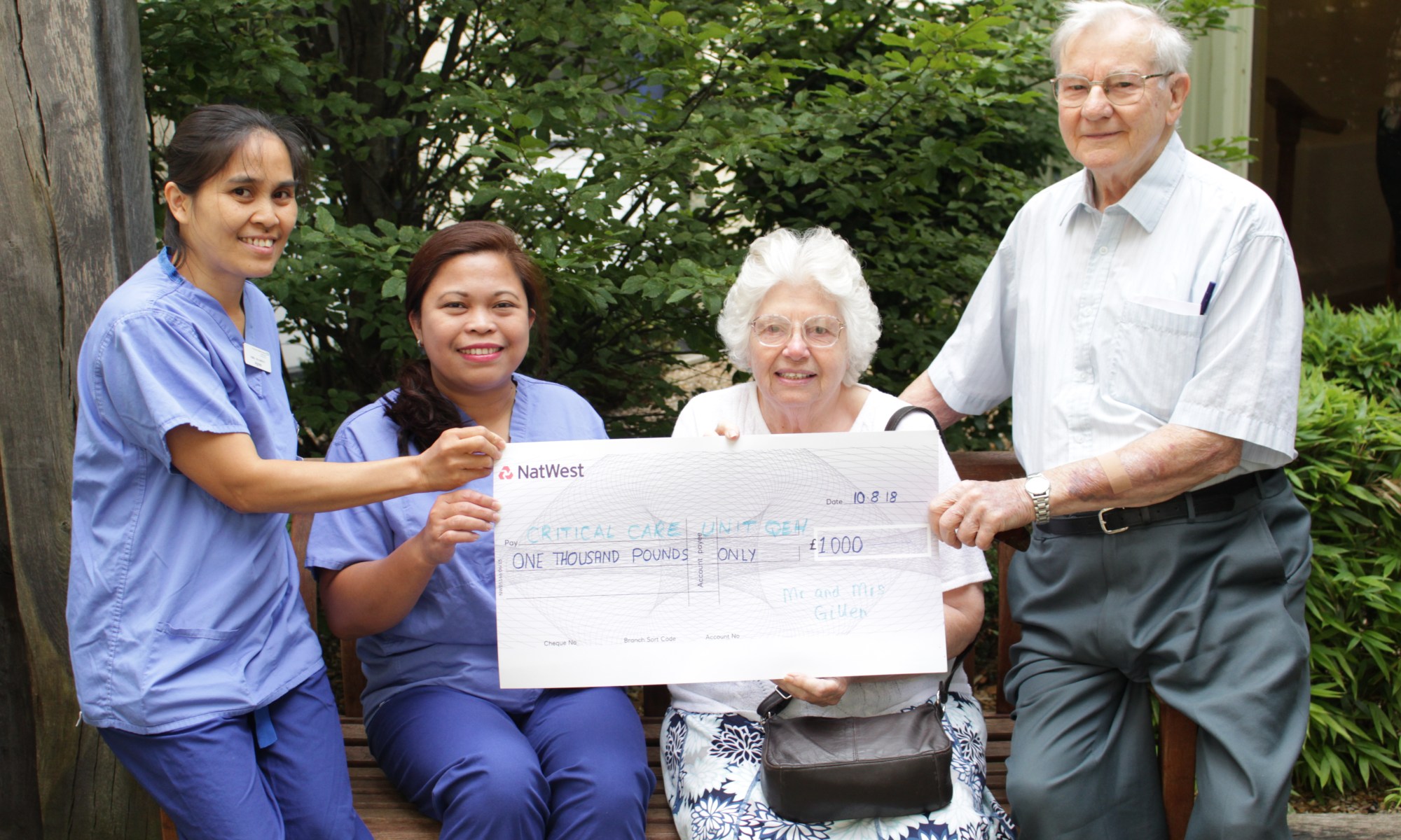 Photo caption: Maud and Joe Gillen present the £1,000 cheque to Critical Care Unit staff nurses Agnes Gallego (left) and Dacille Guno.
