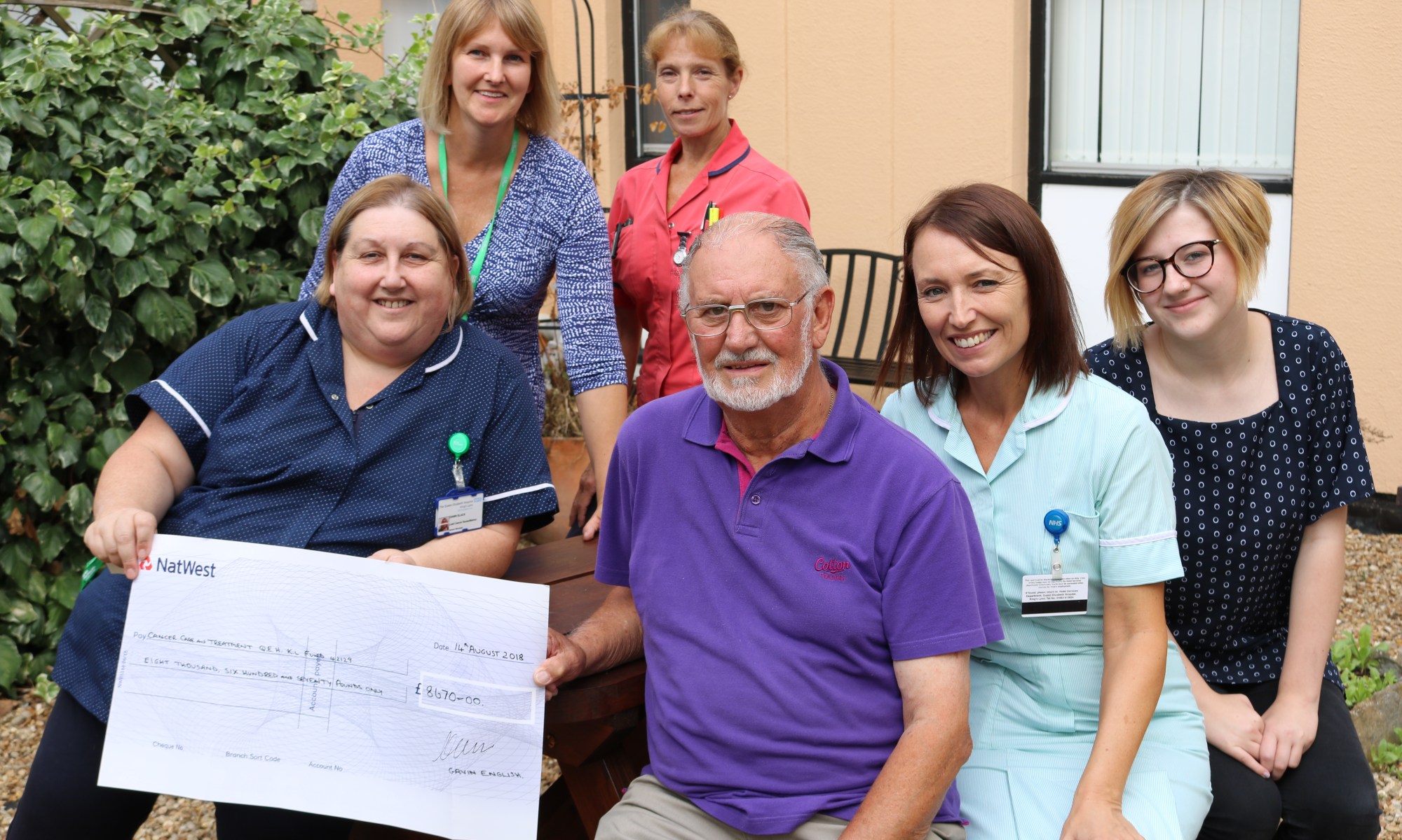 Photo caption: Gavin English presents his latest donation for QEH cancer care and treatment. Clockwise (from left): lead cancer nurse/matron Dawn Slack, Macmillan information and support manager Vicky Mitchell, lung cancer specialist nurse Nicky Shore, receptionist Rachel Murdoch and nursing auxiliary Emma Henry.