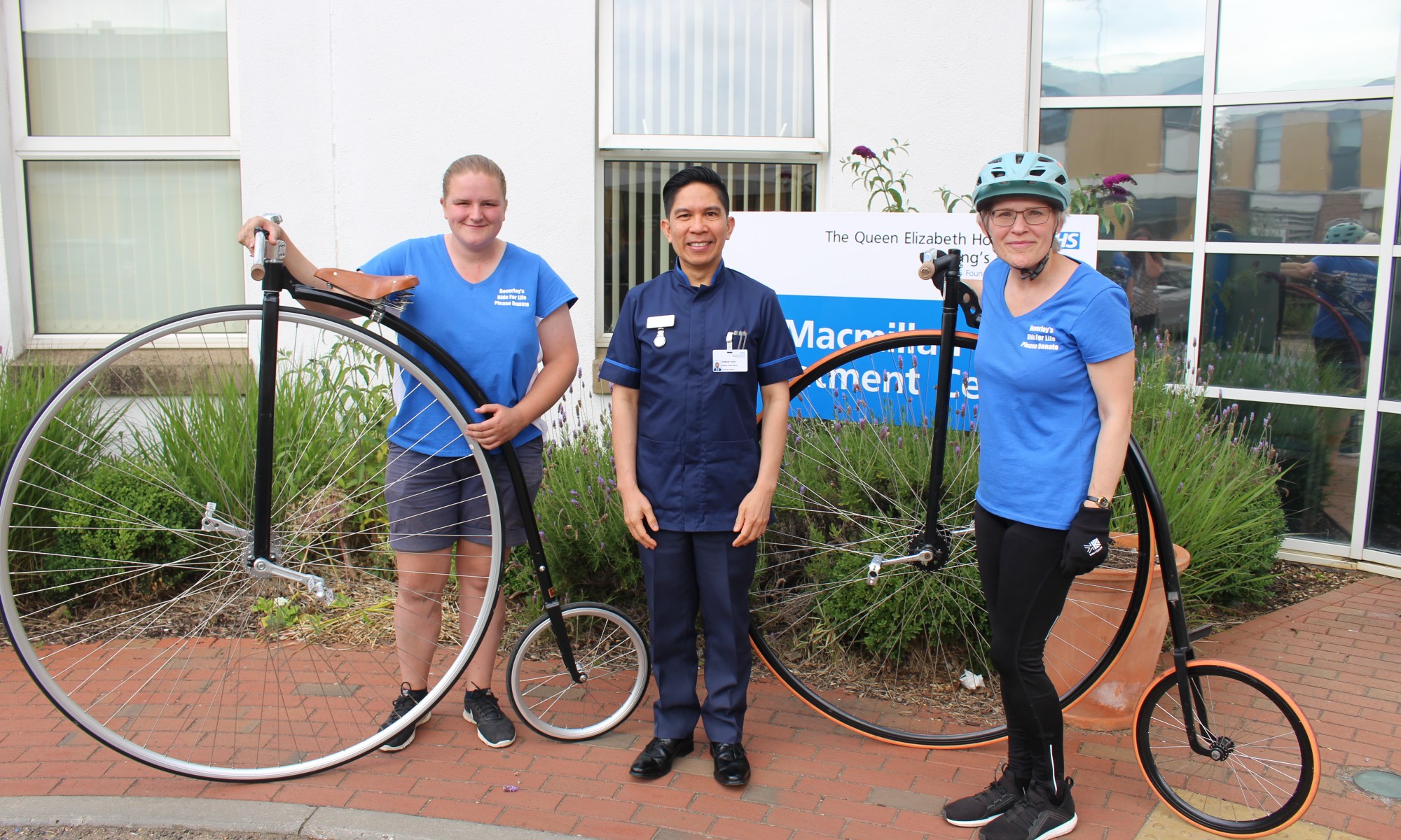 Beverley Wakefield and daughter Laura are thanked by Deputy Chief Nurse Edmund Tabay for taking on the Penny Farthing challenge