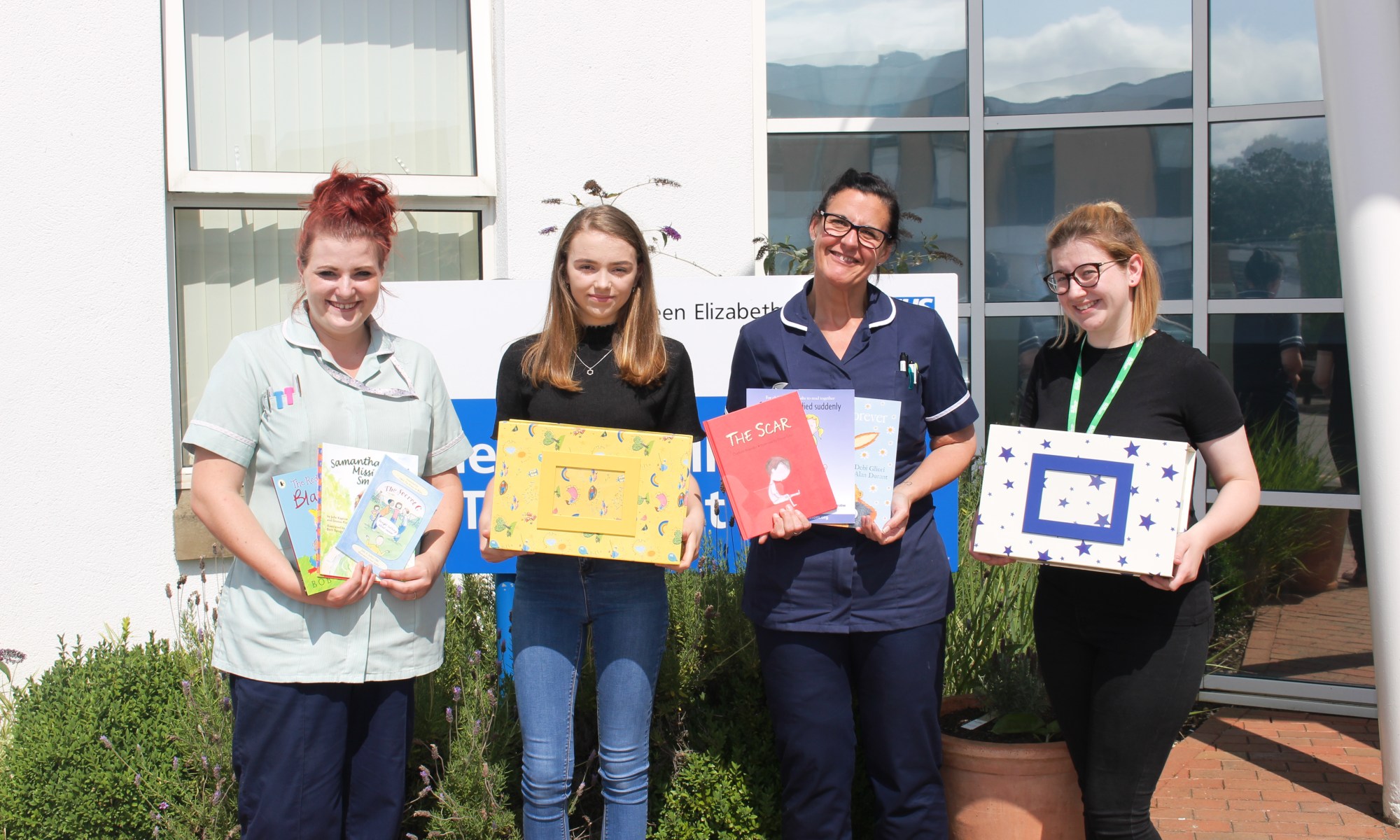Jane’s relatives Kelly Waterfield, Aimee Woolnough and Caitlin Waterfield have presented the boxes to End of Life Care Facilitator Heike Schaefer.
