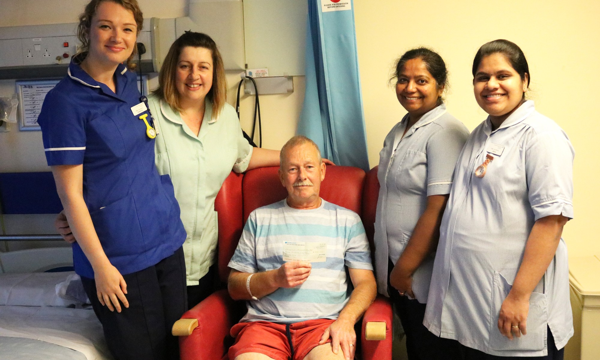 Pictured (from left to right): Katherine Spoelma, Ward Sister, Mel Catton, HCA, Jim Parker, Deepa James, Staff Nurse and Jeena Rasan, Staff Nurse.