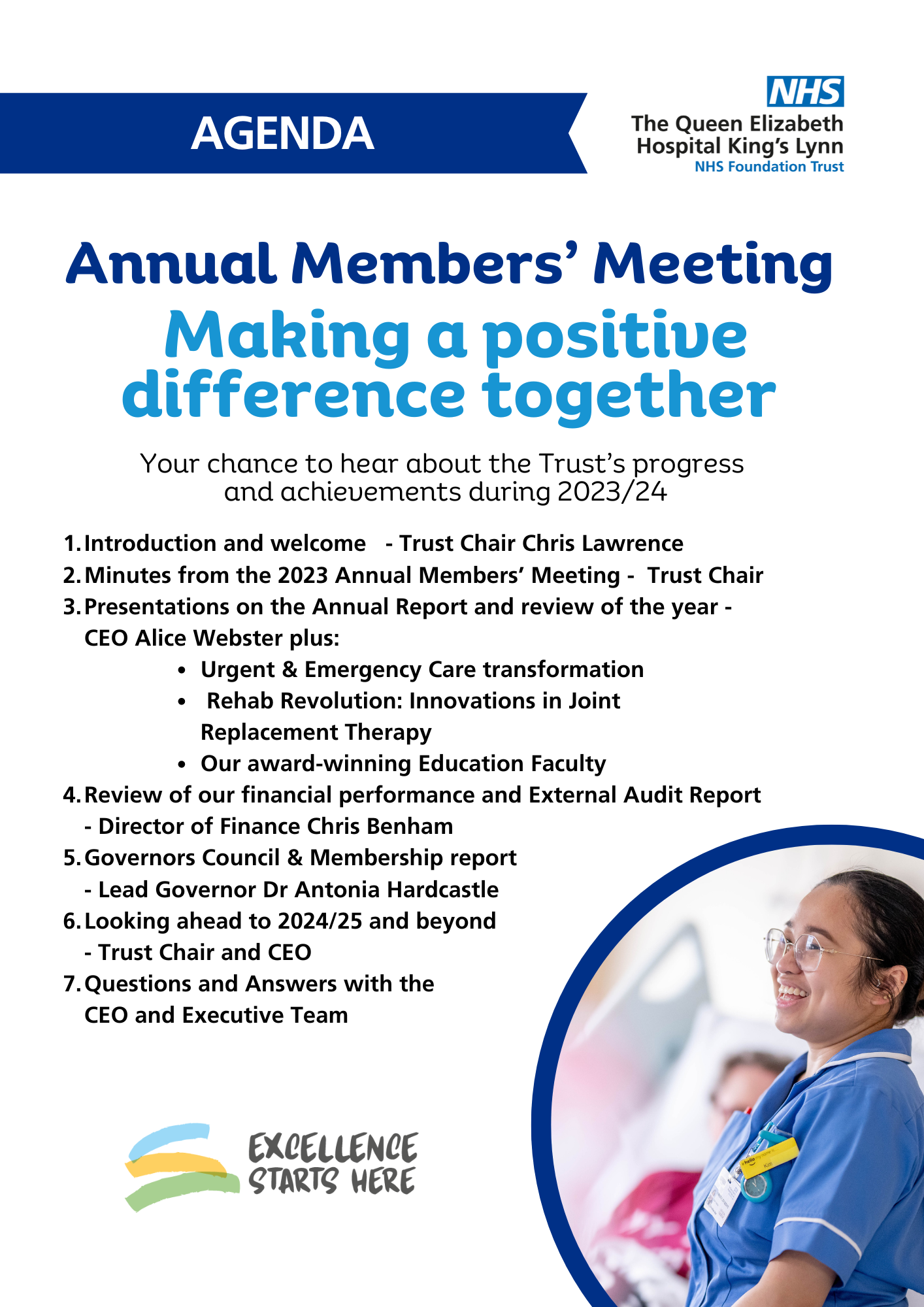 From 3pm to 5pm the Annual Members’ Meeting gets under way and will showcase a range of innovations that have improved services to the community we serve. Come along to hear from the Trust’s Chair, Chief Executive, directors, clinicians, and governors about the services we have delivered, and the progress and achievements made during 2023/24.