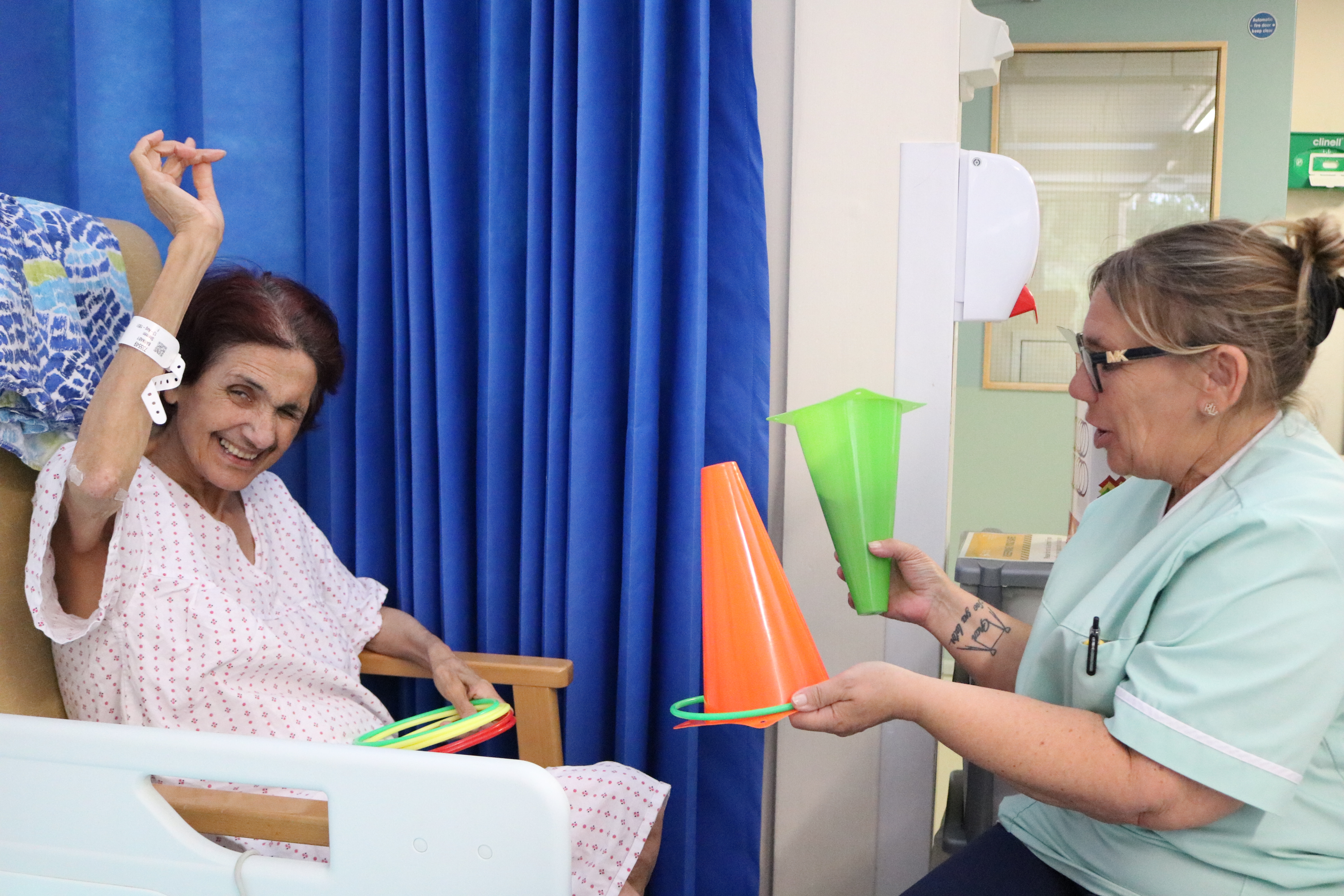 Keeping active, like encouraging patients to keep their arms and legs moving in bed or chair, not only improves how patients feel but it can prevent falls and reduces the length of stay in hospital, meaning patients get home faster.