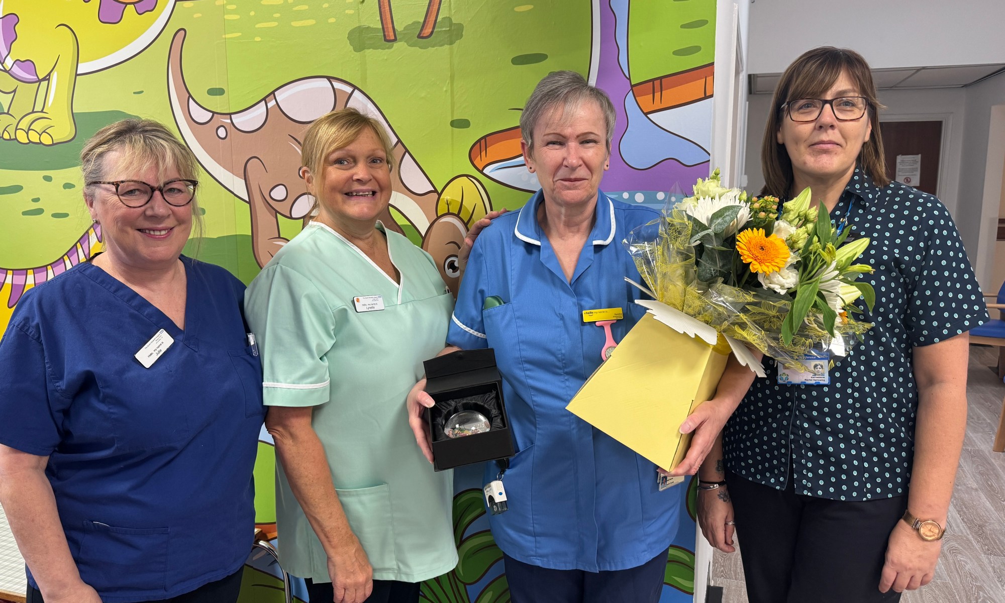 In a touching gathering within the hospital’s Outpatient Department on Friday (1 November), colleagues looked on with pride as Trust CEO Alice Webster presented Sandra with a vibrant bouquet and an elegant glass paperweight to mark her golden anniversary of nursing.