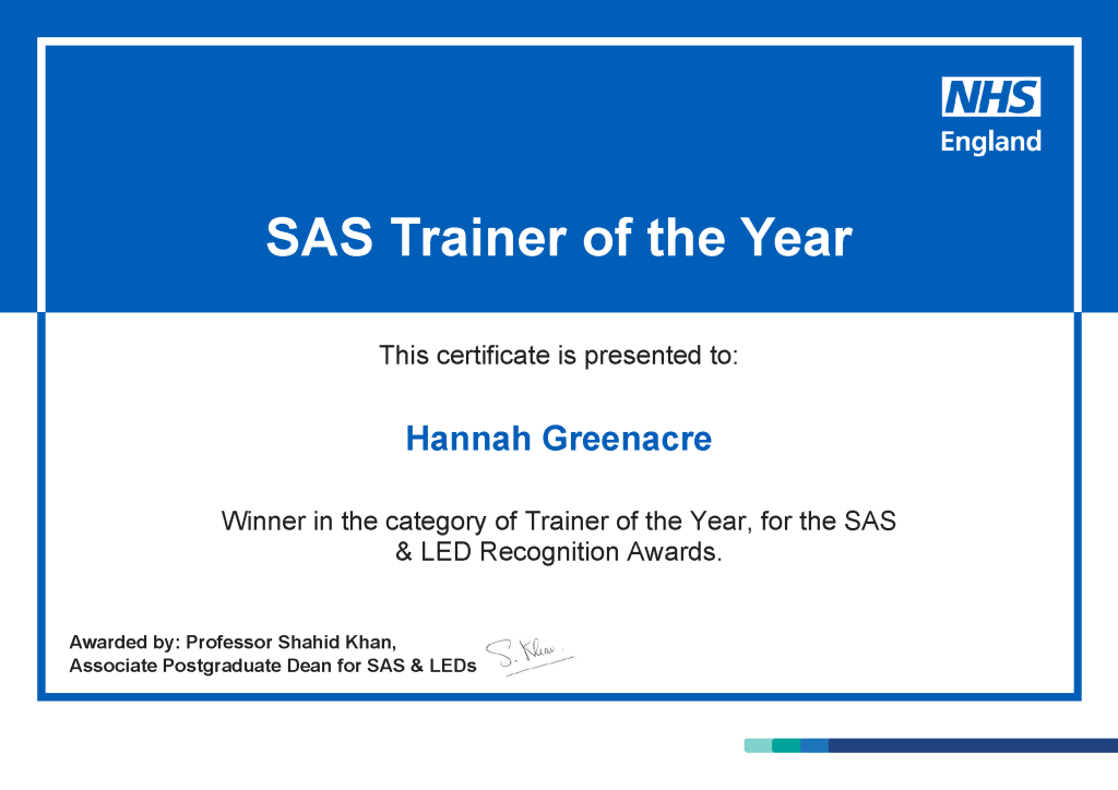 Hannah was nominated for the award by the hospital’s Specialty and Associate Specialist (SAS) Tutor Narayanan Vinod Kumar.