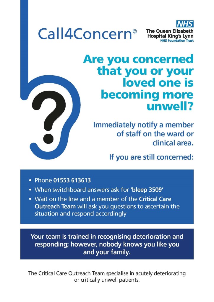 The hospital has implemented a Call for Concern (C4C) service, which allows patients and families to contact the Critical Care Outreach Team 24/7 via a dedicated phone or text line when it is felt deterioration concerns have not been addressed by the team looking after the patient.