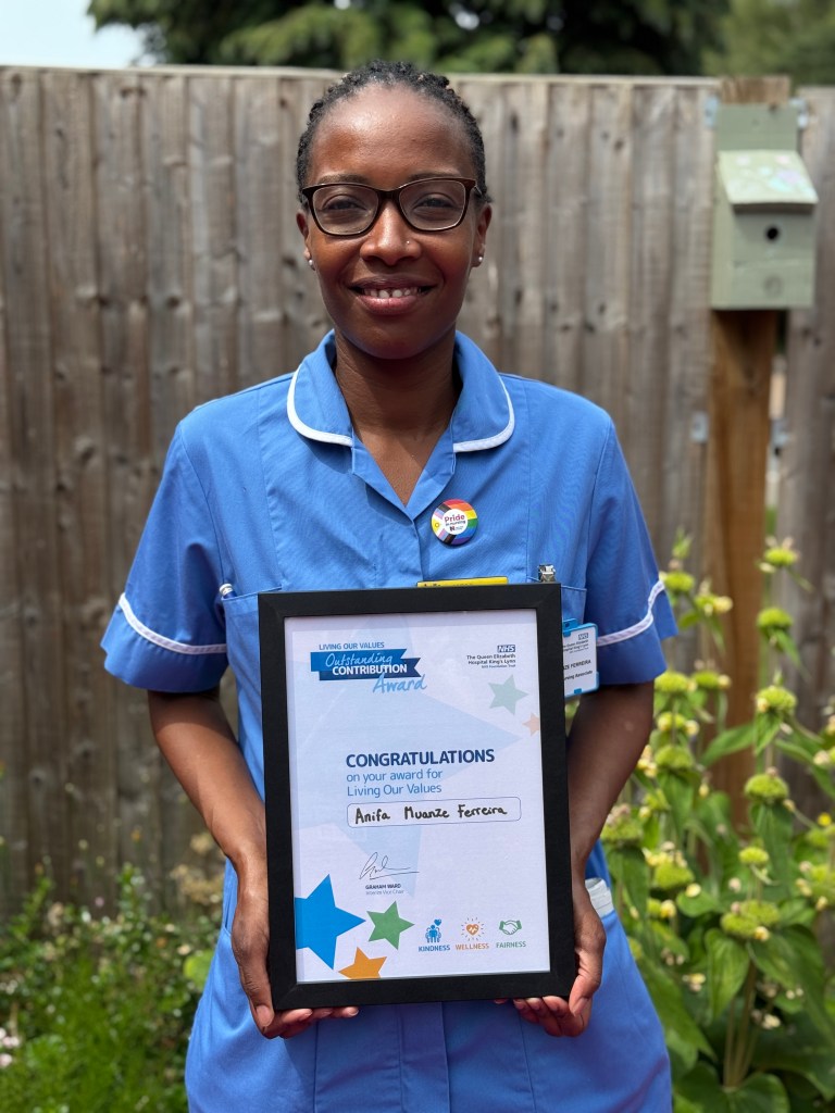 Last week nursing degree apprentice Anifa Muanze Ferreira, who started as a hospital domestic nine years ago, was awarded an Outstanding Contribution for Living Our Values Award for unwavering dedication and commitment.