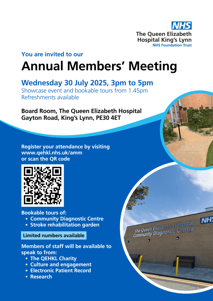 Members of the public are invited to learn more about The Queen Elizabeth Hospital King’s Lynn NHS Foundation Trust’s (QEH) year of achievements at the Annual Members’ Meeting on Wednesday 30 July.