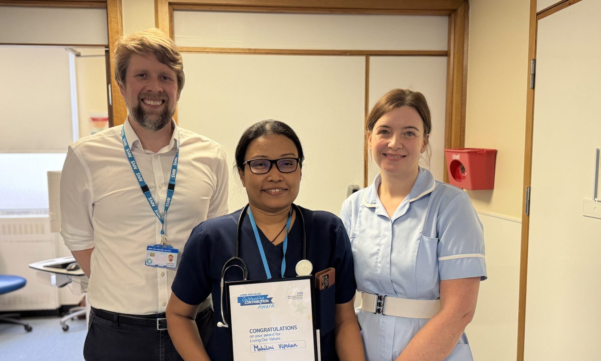 Senior Clinical Fellow Mahilini Vipulan was awarded the Outstanding Contribution to Living Our Values Award on Friday 20 February in a surprise ceremony with QEH Director of People, John Syson and her colleagues.