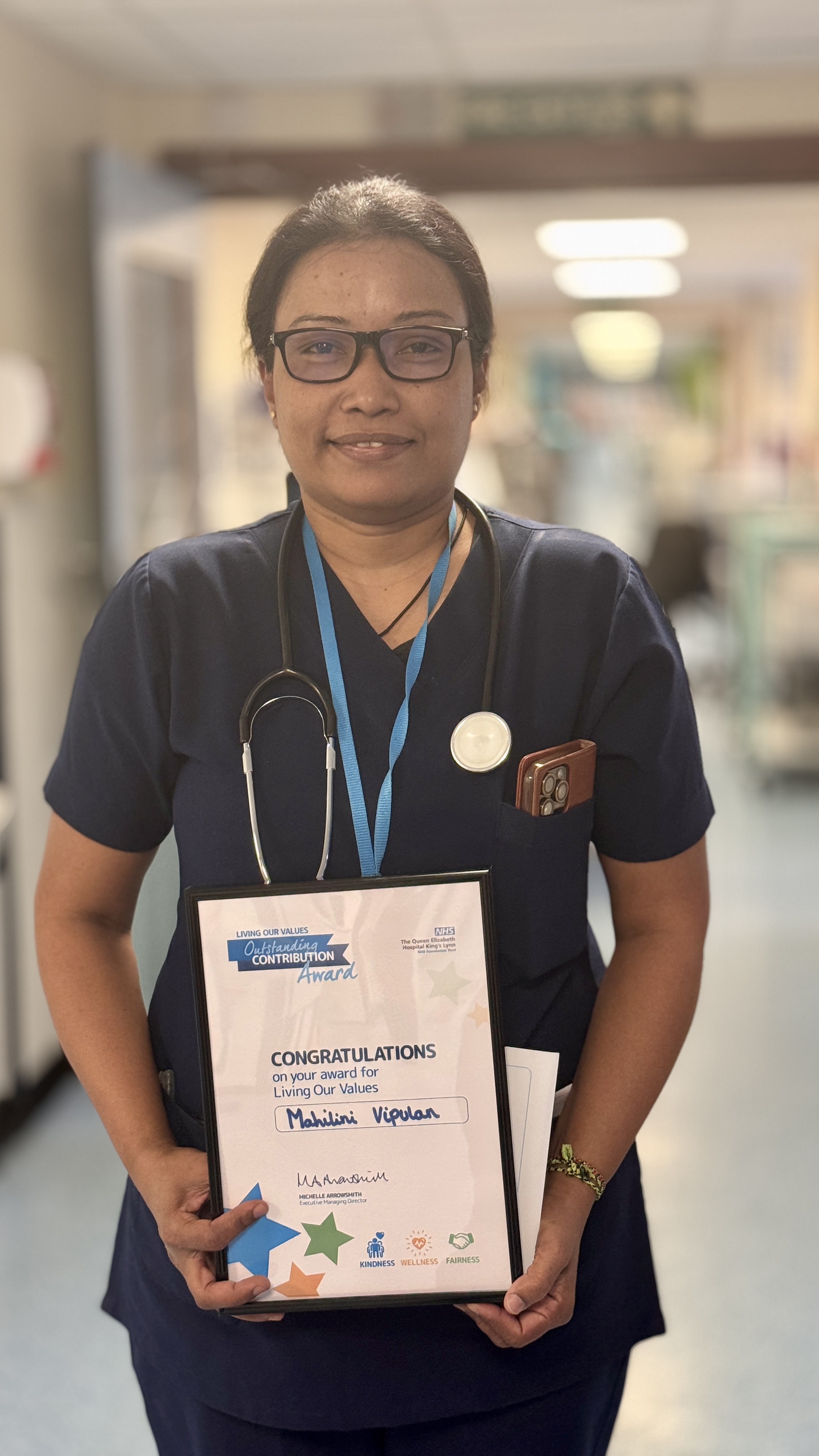 Senior Clinical Fellow Mahilini Vipulan was awarded the Outstanding Contribution to Living Our Values Award on Friday 20 February in a surprise ceremony with QEH Director of People, John Syson and her colleagues.